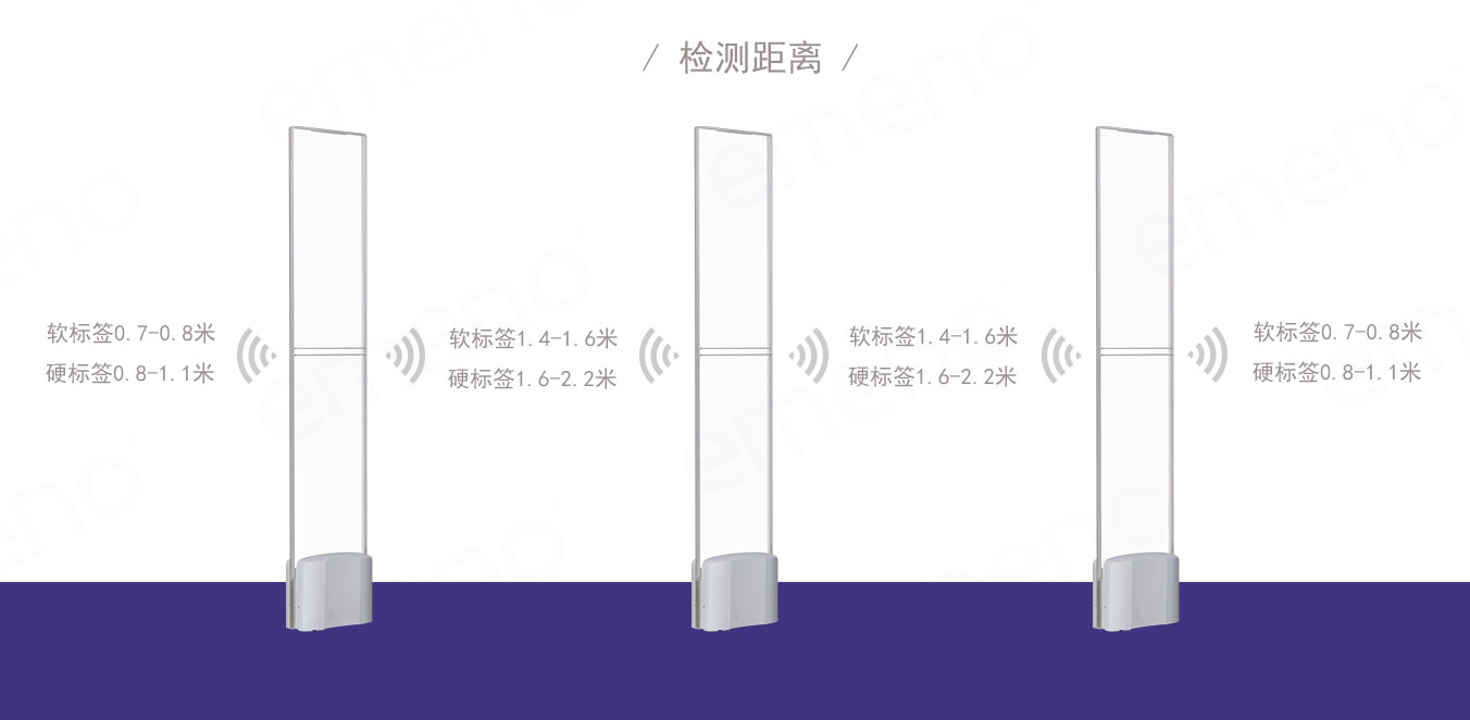 AM9600能夠出色的檢測58Khz DR軟標(biāo)簽和硬標(biāo)簽。兩支防盜天線之間的檢測距離可高達(dá)軟標(biāo)簽1.4-1.6米, 硬標(biāo)簽1.6-2.2米,是寬出口或多個(gè)出口的商店的理想選擇。