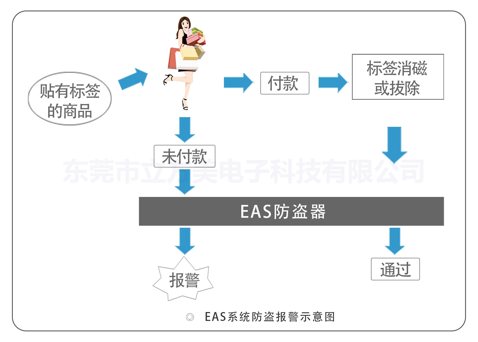 撇開以往人盯人這種簡單粗暴效果又差的防盜方式,目前店鋪防盜普遍采取的方式是在店鋪門口安裝EAS防盜器,也就是平時我們看到的那些立在在超市門口,超市收銀臺,服裝店門口的設(shè)備。如下圖所示: